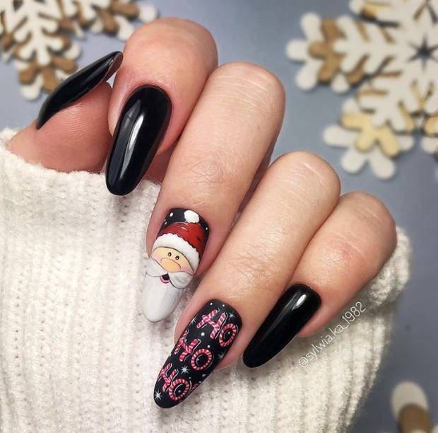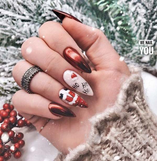 Очень популярными, который год подряд являются тематические Новогодние рисунки на ногтях. Различные Новогодние гирлянды, Дед морозы, снеговики, елки, елочные шары и снежинки. Сочетать их можно с любым цветом и дизайном маникюра. Такие рисунки мастера делают как при помощи кисточки и гель-красок, так и при помощи стемпинга или наклеек. Посмотрите какие красивые и сказочные получаются ноготки с этими рисунками.