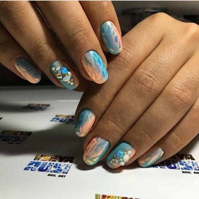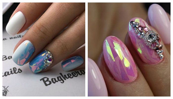 «Битое стекло» — отличный вариант нейл-арта для дня рождения. Такой дизайн можно размещать на каждом ноготке, но удачным вариантом станет выборочное расположение на некоторых ногтях. Цветовая гамма маникюра выбирается сугубо индивидуально, в зависимости от наряда и тематики вечеринки.