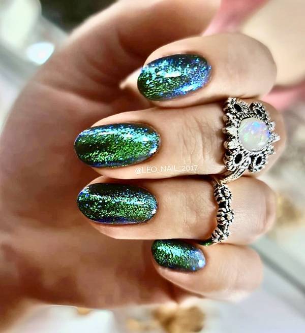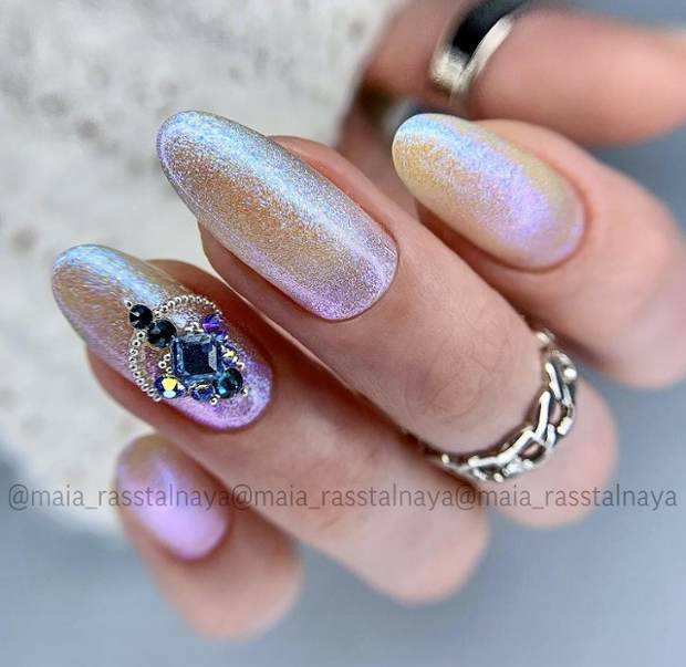 Применяются для декорирования ногтей, переливаются разными оттенками, создавая дизайн с эффектом металлического покрытия. А наносить яркие пигменты могут как на цветную подложку, например, черную или белую, так и поверх прозрачной базы.