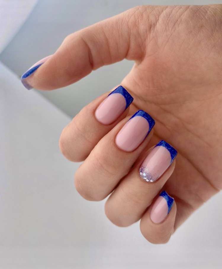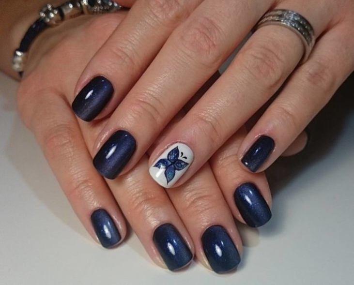 Самый глубокий цвет, комбинируется с белым тоном. Синий оригинально смотрится в маникюре с красным и чёрным. Светло-серый и синий подойдёт для будней и официальных торжеств.