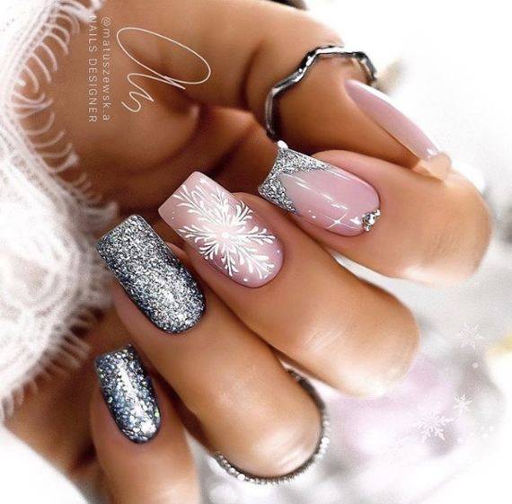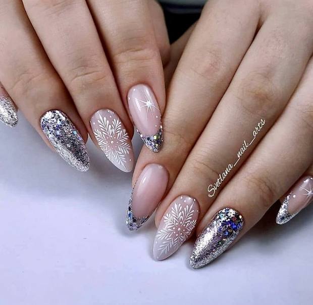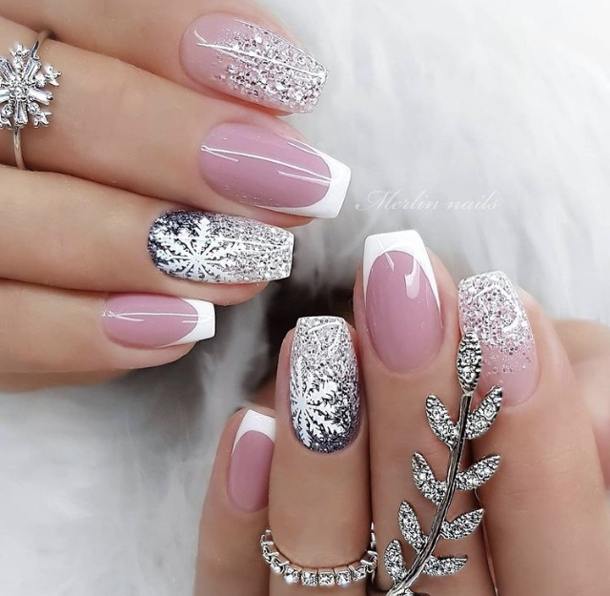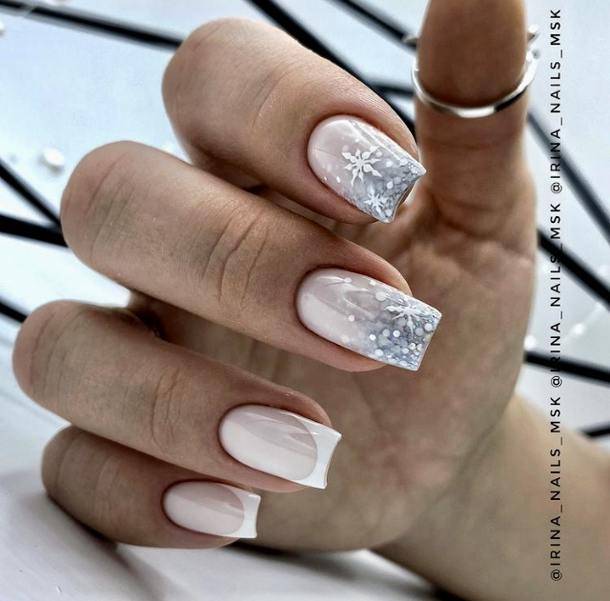 Нежно и модно смотрится классический белый нежный френч в сочетании с блестками и снежинками.