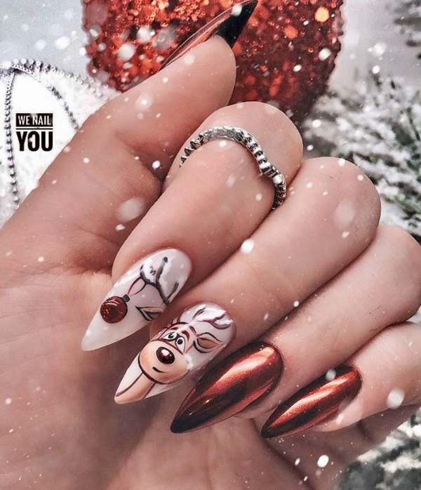 Для девушек с длинными ноготками подойдут и однотонные, и яркие, и составные из нескольких цветов дизайны. Кроме того, на длинных ногтях очень стильно и модно будут выглядеть: блестящий френч, елочные шары, выложенные стразами, вязанный дизайн, различные рисунки снеговиков, оленей, дедов морозов, металлическая втирка, эффектные градиенты и растяжки из блесток.