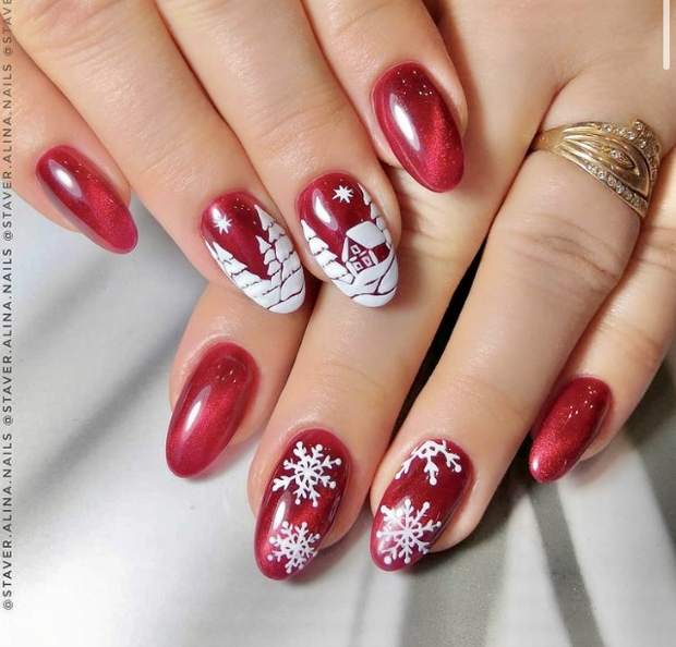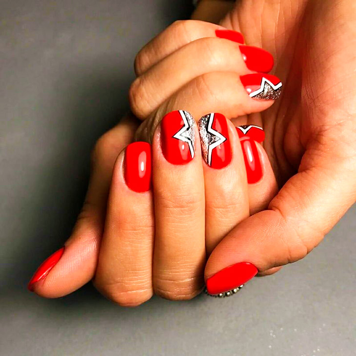 Также, очень стильно и ярко, на коротких ноготках будет смотреться сочетание красного, черного или серого гель-лака, с серебряными блестками или красивыми тематическими Новогодними рисунками на одном-двух ноготках. Например, очень мило выглядят рисунки елочек, звездочек, елочных шаров или зимней варежки. А если еще, ногти покрыть матовым топом, будет вообще шикарно.