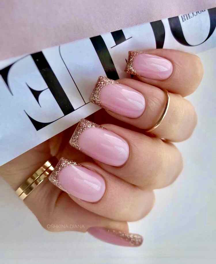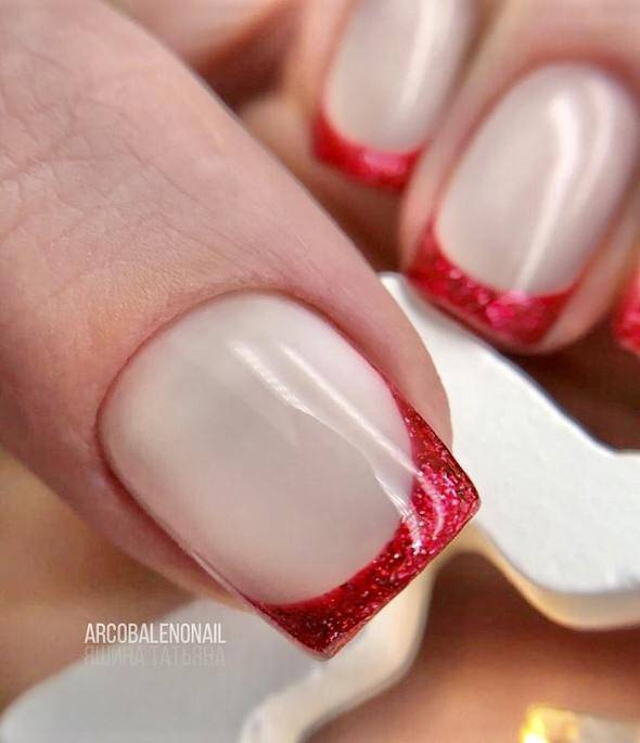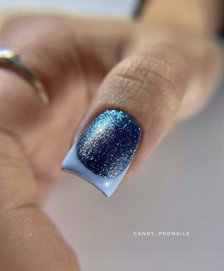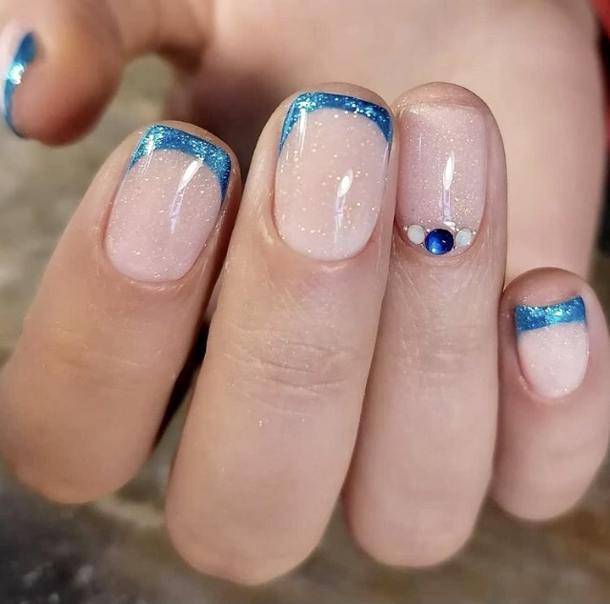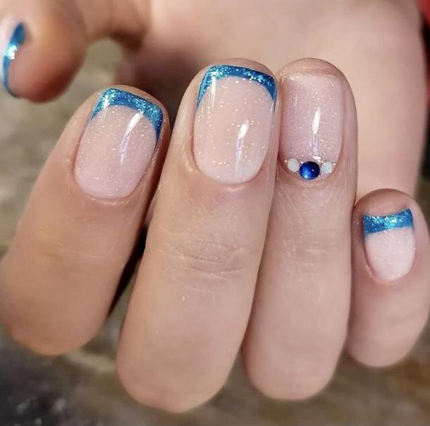 Очень стильно смотрится френч с блестками на коротких ноготках, в любых цветовых решениях.