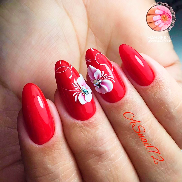 Кроме того, очень красиво и нежно смотрятся рисунки небольших красных, белых и голубых цветов, в сочетании с красным гель-лаком.