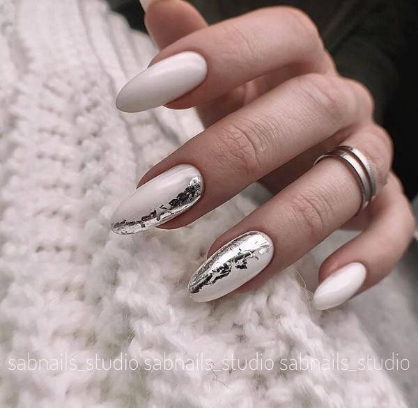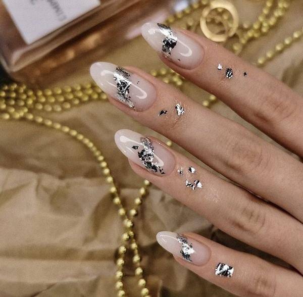 Фольга – самый трендовый вариант декора ногтей. Для выполнения праздничного дизайна пригодятся эти очень тонкие металлические пластины. Они могут быть разных оттенков: платинового, золотого, медного, изумрудного, рубинового и других. Если аккуратно нанести на покрытие один элемент из фольги, можно получить красивый переливающийся орнамент разных форм и очертаний.