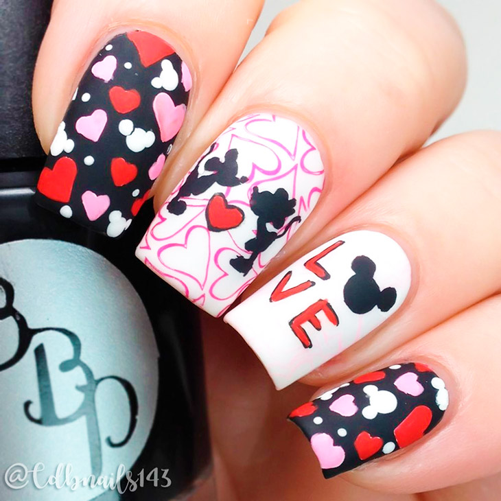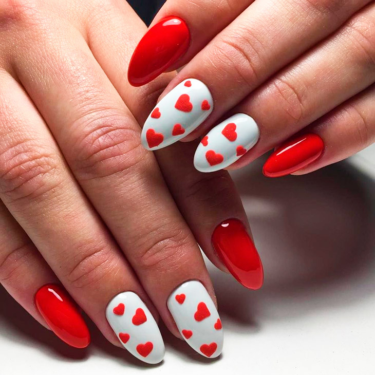 Мило и романтично смотрятся рисунки сердечек в сочетании с красным дизайном. Как правило красные или черные сердечки наносят на белый или нюдовый фон, на один или несколько ноготков. Кроме того, очень красиво смотрится этот дизайн покрытый матовым топом.