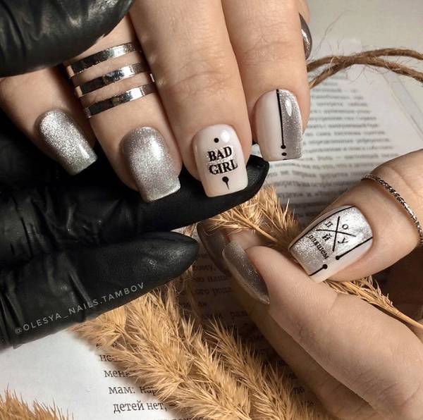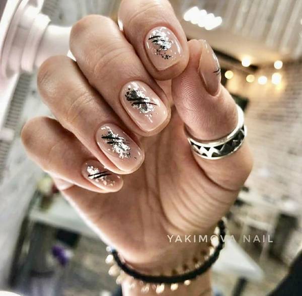 Также, в этом году очень популярными остаются рисунки с абстрактными силуэтами и лицами. Они могут быть выполнены в сочетании с дизайном «разные руки», покрыты матовым или глянцевым топом, и украшены фольгой или блестками.
