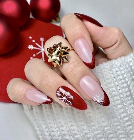 Очень красиво и оригинально будет выглядеть белый френч с рисунком елочного шара на ноготках, или красно-белый френч с рисунком снежинки.