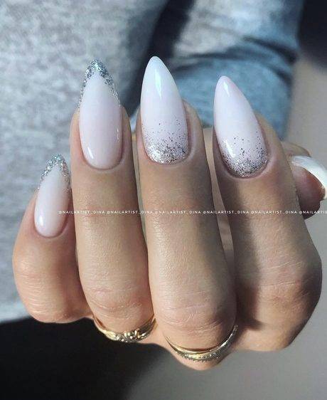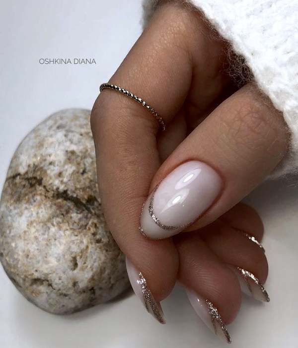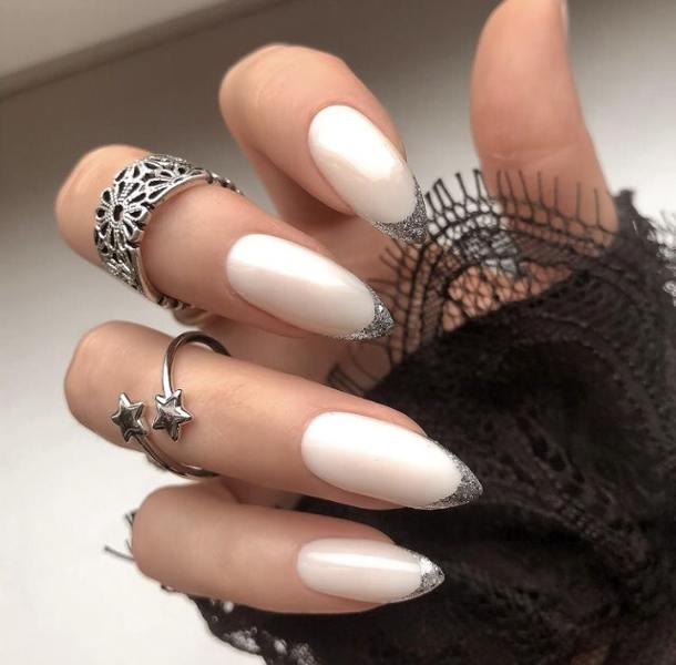 Очень современно и оригинально будет выглядеть блестящий французский маникюр на длинных острых ноготках или на ноготках формы балерина.