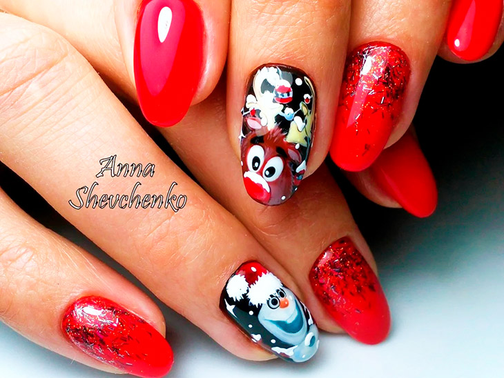 Посмотрите какие красивые и необычные Новогодние рисунки сказочных и мультяшных персонажей, можно добавить к праздничному дизайну ноготков. Например, снеговика Олафа, Микки мауса, пингвинов или даже Гринча.