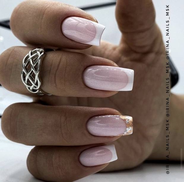 Очень стильно и празднично смотрится белый френч с отпечатками серебристой, золотой или красной фольги.