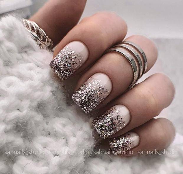 Если хочется красивых переходов на ноготках, то смело делайте градиент. Кроме того, в этом праздничном сезоне очень модно поверх цветного градиента, дополнительно делать легкую растяжку серебряными блестками. Это выглядит очень стильно и нарядно.