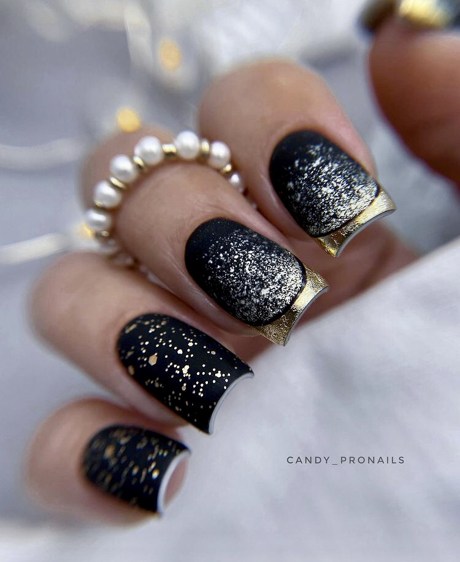 Стразы и блестки отменно впишутся в вечерний дизайн ногтей, особенно, если есть «поддержка» в виде красивого макияжа, да еще и с блестящими элементами. Популярным вариантом дизайна, который используется для новогоднего маникюра, вечернего, праздничного – это космический нейл-арт. Также в тренде использовать темные оттенки с блестками разных цветов, объединение блесток и страз в одном дизайне.