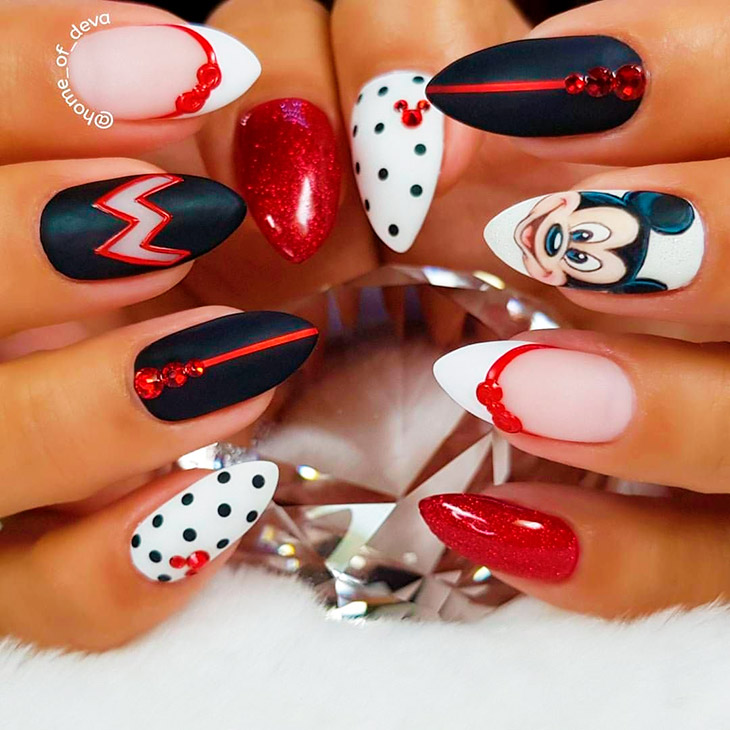 Оригинально и весело смотрятся рисунки микки мауса или божьей коровки, в сочетании с красным дизайном.