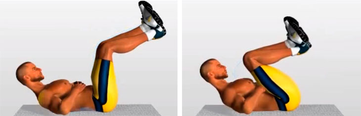 - Поднимите туловище , ноги, держите их на весу, руки за головой. Цель – поочередно касаться локтем пятки противоположной ноги.