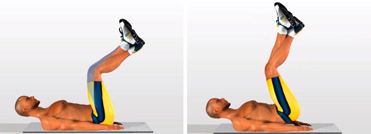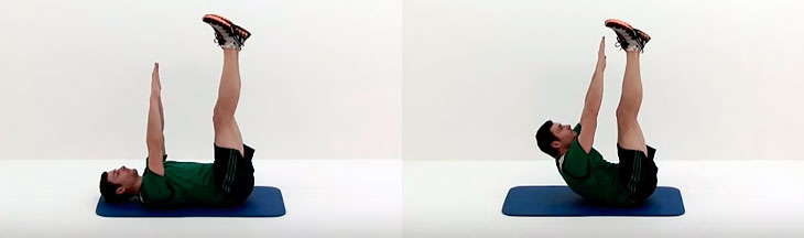 Стараемся дотянуться обеими руками до щиколоток поднятых вверх ног или дотянуться до носков. Во время этого упражнения ноги можно выпрямить или держать согнутыми под углом 90 градусов. Не стоит делать никаких лишних движений, подниматься и опускаться должна только верхняя часть вашего тела.