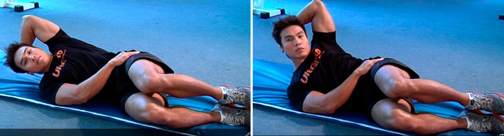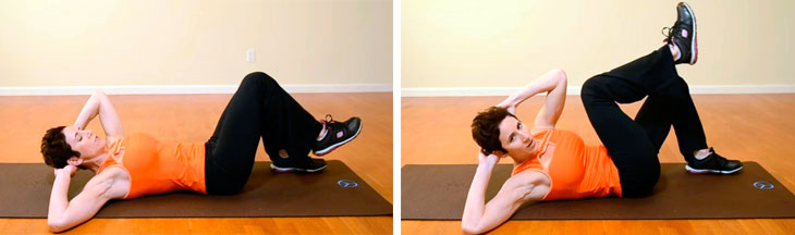 В положении лежа пытаемся правым локтем коснуться левого колена, рука находится за головой. Ногу нужно сгибать и разгибать, при этом ни в коем случае не опускаем ее не пол, ведь только в этом случае упражнение будет эффективным. Вторая рука лежит за головой или на животе, это позволит ощущать работу мышц. Старайтесь, чтобы амплитуда ваших движений была как можно больше.