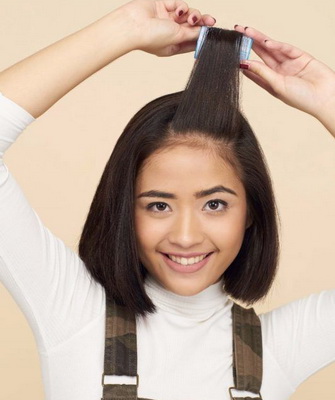 - При недостаточной густоте волос под начесом выделяются несколько прядок, которые начесываются и к ним крепятся накладные локоны.