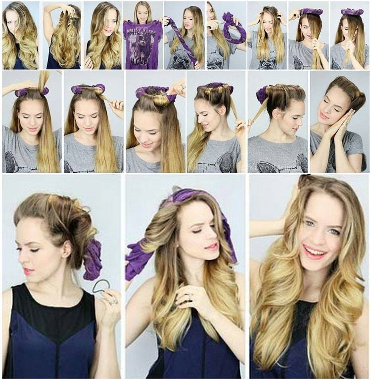 Изначально футболку скручивают в жгут. Соединяют оба конца, превращая его в своеобразный веночек. Надевают заготовку на голову, а затем поочередно закручивают волосы (каждую отдельную прядь), начиная от лица (по принципу греческой прически).
