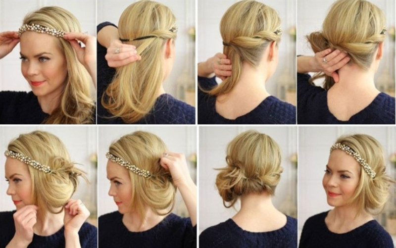 Зачешите волосы набок и наденьте гламурный ободок. Продеваем волосы за ободок – прядку за прядкой. Вуаля! Обладательницам коротких волос советуем пригладить локоны гелем и (куда ж без него?) надеть ободок!