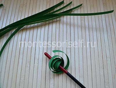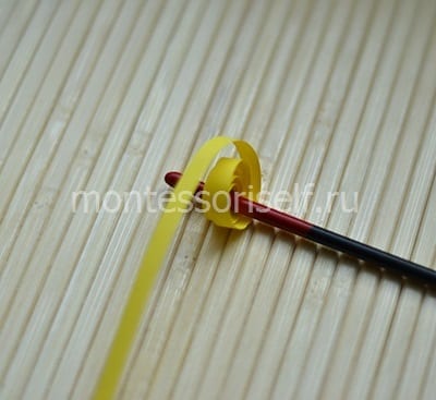 Переходим к технике квиллинг (или бумагокручения). На специальный инструмент или тонкую палочку накручиваем желтую полоску бумаги (лучше воспользоваться специальными лентами для квиллинга). Делаем несколько таких бумажных завитков. Кончики заготовок фиксируем клеем.