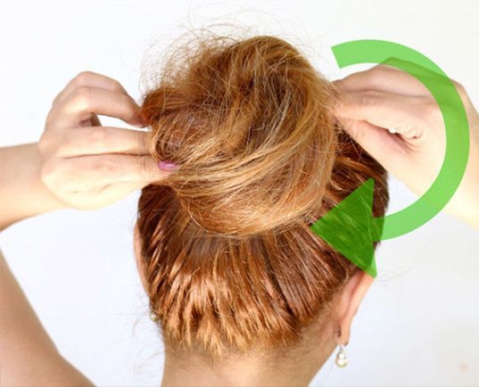 - Оберните жгут вокруг резинки, спрятав ее под волосами.