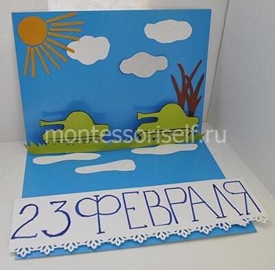 Украшаем задний план поделки солнышком, тучками и деревом. В некотором отступлении от заднего фона фиксируем два танка и травку. На горизонтальную часть открытки приклеиваем белые сугробы из бумаги.