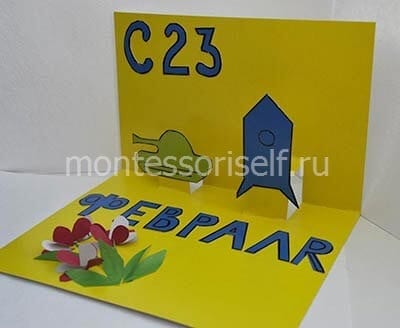 Украшаем места с выступами ракетой и танком, вырезанными из бумаги. Делаем на стенде поздравительную надпись и украшаем его цветами. Поделка на 23 февраля — готова!
