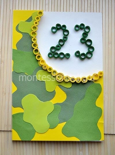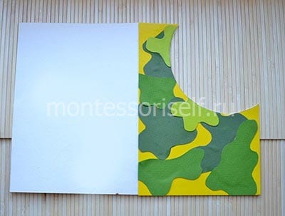Очень интересная открытка на 23 февраля получается в технике квиллинг. Нам понадобится сделать основу открытки. Для этого сгибаем лист картона вдвое. На лицевую сторону поделки приклеиваем желтую бумагу. Поверх нее располагаем зеленые пятна, имитирующие рисунок военного камуфляжа. Отрезаем от верхней части достаточно большую область. Основа поделки — готова!