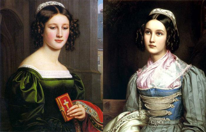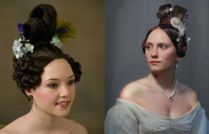 Прическу в стиле бидермейер узнать просто. Дамы носили сооружения из кос и локонов. Сзади волосы убирали в пучок, который делали преимущественно из кос. Фактуру элементу также добавляли с помощью буклей. В центре пучка часто делали высокую петлю.