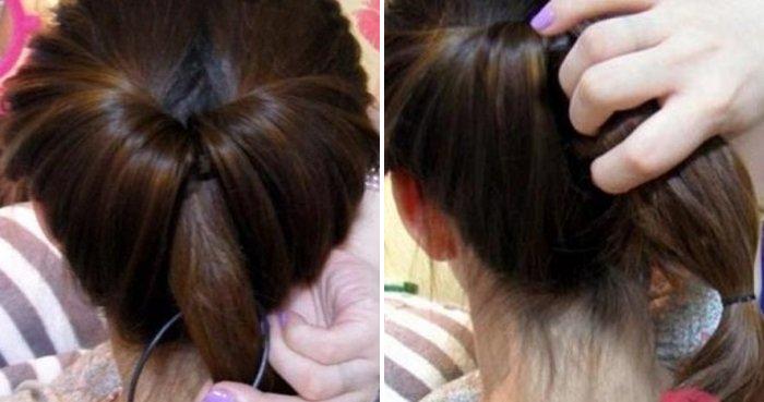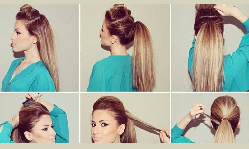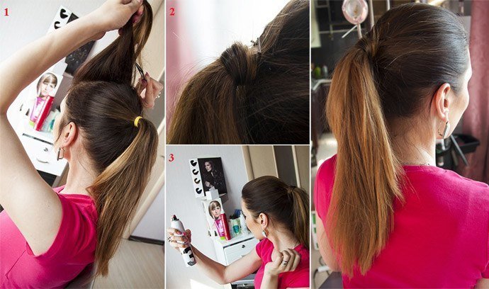 - Зачешите все назад и свяжите конский хвост.