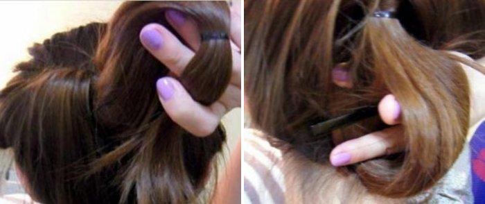2. Сзади у самой резинки закрепите две невидимки – они должны за нее зацепиться. Не забудьте убедиться, что кончики не мешают и не впиваются в кожу. Такой простой и легкий способ позволит добиться объема.