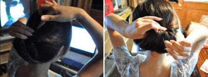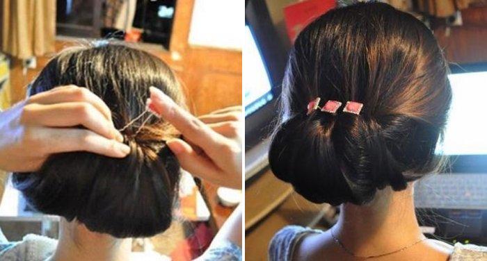 - Закрепить волосы на затылке с помощью невидимок.