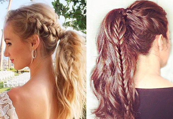 Очаровательно смотрится конский хвост с плетением – прическа, которая подойдет как для повседневной носки, так и для торжественного мероприятия. Вариантов одновременного создания хвостового элемента и косы существует невероятно много. Так, при наличии длинных волос косичку можно оплести вокруг головы, после чего соединить ее с основной копной волос, собранной сзади. Перед началом сборки можно отделить одну из прядей и заплести ее в косу, после чего сделать прическу привычным способом. Кроме того, в косу можно заплести и уже собранные волосы, оставив их концы свободными.
