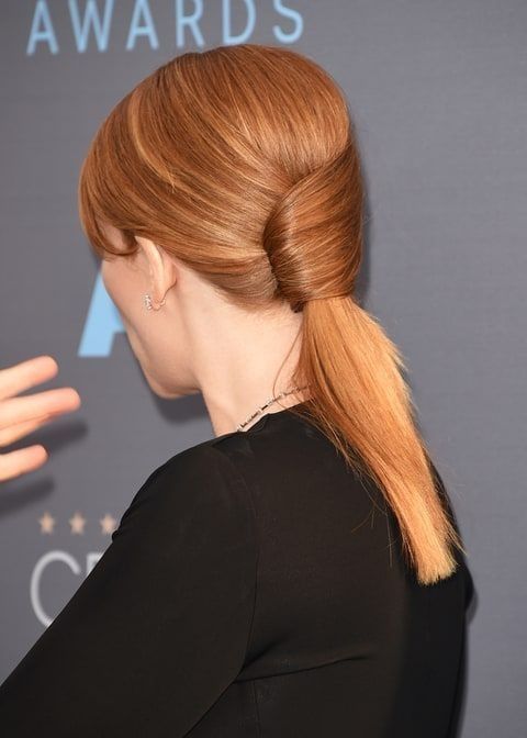 Укладка, которая будет уместна и в офисе, и на вечеринке. Собирайте волосы на затылке, а чтобы сохранить нужную высоту, используйте небольшую заколку-крабик, прикрепив ее под самой резинкой.