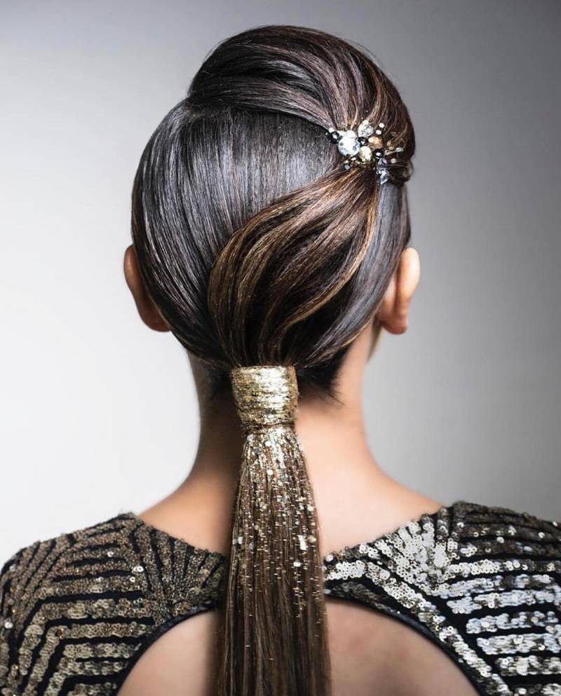 Хвостик с блестящими камнями, кристаллами – роскошная праздничная причёска, которая произведёт настоящий фурор. Проще всего применять заколки, невидимки и прищепки с такими украшениями.