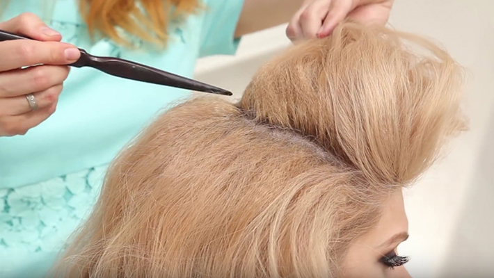 - Для легкости и романтичности, дополнительного объема создается начес, который делают сверху и на височных областях.