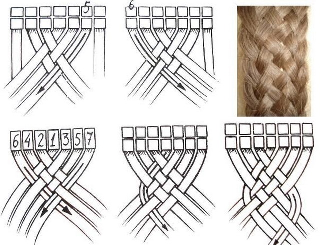 - Применяется та же технология, что и при пяти прядях, но добавляются еще две пряди с разных сторон, которые будут накладываться на крайние и проплетаться поочередно с каждой стороны.