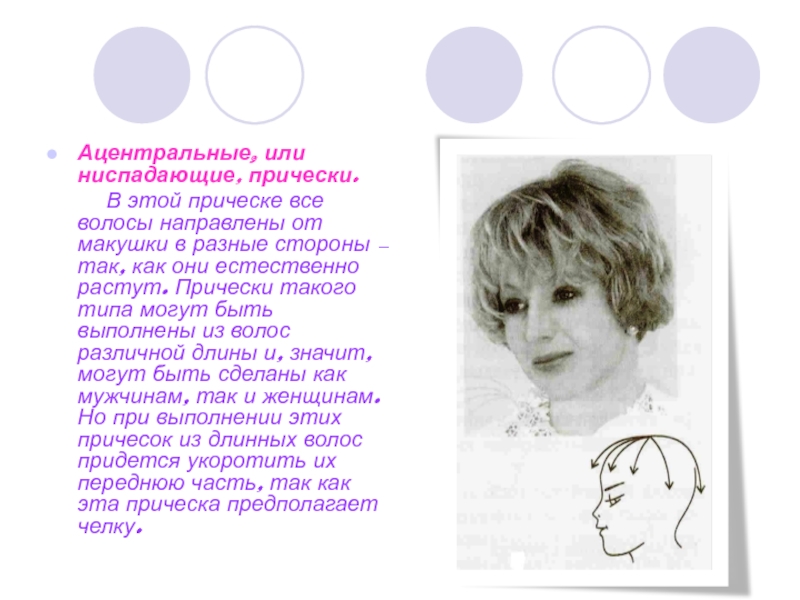 Слайд 4Ацентральные, или ниспадающие, прически. В этой