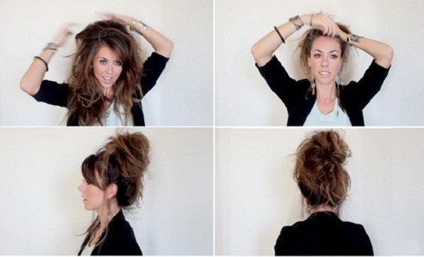 Высокий пучок можно сделать без использования подручных средств доверяя эффект объемной шишки хорошему начесу.