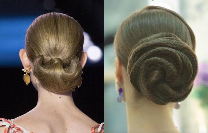 Лучшими остаются низкие и средние пучки. В противном случае нижний слой волос будет выбиваться из прически и его придется заколоть невидимками в цвет.
