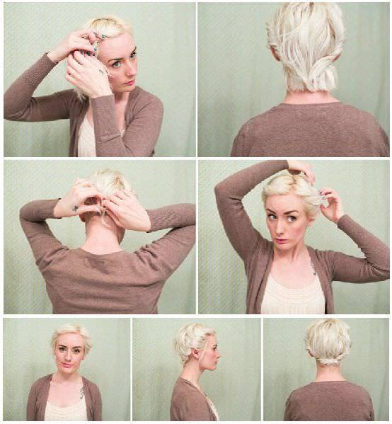 На короткие волосы можно также выполнить вышеописанную прическу стиляг под названием «высокий полет». Пошаговое фото поэтапно покажет весь процесс создания укладки.