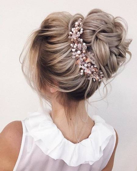 Высокий пучок. Что может быть красивее, чем блестящие и здоровые локоны, гладко-гладко уложенные в высокий узел и образующие «корону» на голове невесты? Такая прическа придаст облику невероятную аристократичность!