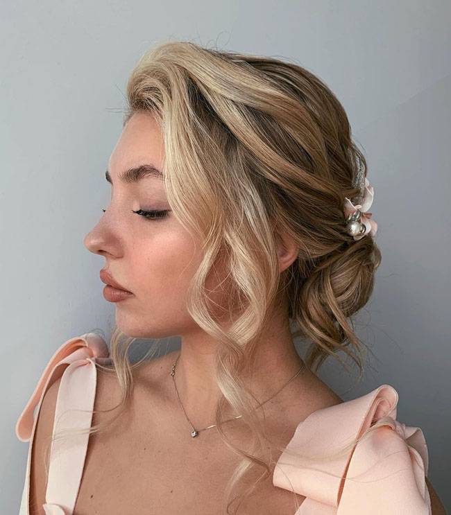 - Украсить прическу цветком, прикрепляя его с противоположной стороны от созданной прически.