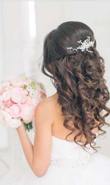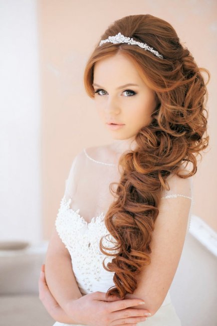 Аккуратно завитые локоны, спадающие на плечи, подойдут в том случае, если платье не слишком объемное и с открытыми плечами. На распущенных волосах прекрасно будет смотреться фата, спускающаяся с середины затылка. Подойдут украшения из цветов, настоящих или искусственных.