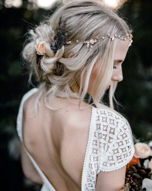 Если удлиненное каре, можно сделать ракушку. Если боб с длинными прядями у лица, то собрать волосы в низкий небрежный пучок. Если платье в стиле бохо или рустик, добавьте различные плетения и живые цветы.