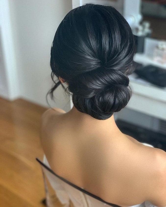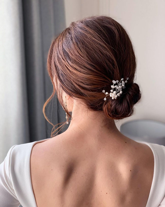 Обладательницам волос средней длины подойдёт свадебная причёска пучок и ракушка. Делают низкий, средний и высокий пучок лёгкой текстуры и гладкий низкий пучок, собранный не по центру, а справа или слева от лица.