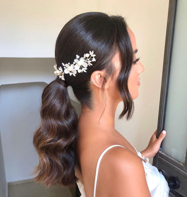 Хвост – высокий или низкий остаются свадебными фаворитами 2021 года, поэтому выбор прически стоит делать, исходя из типа лица. Для более элегантного и строгого образа предпочтительнее высокий хвост, для нежного и романтичного – низкий.