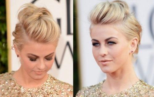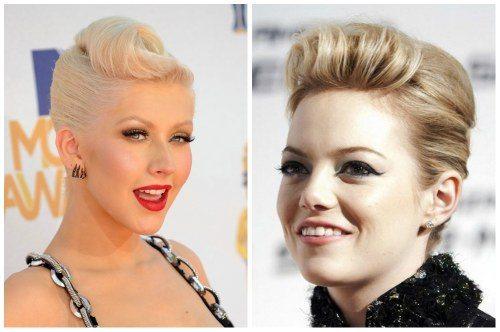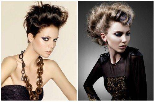 Конечно, для деловой дамы подобная прическа вряд ли подойдет, но а для той, которая любит эксперименты, очень даже. Челка высоко зачесывается, а волосы на висках либо закручиваются в локоны и выпускаются, либо плотно прилегают к голове. В случае короткой стрижки могут выбривают виски или оставляться максимально короткими. Здесь женский вариант прически будет напоминать мужской.
